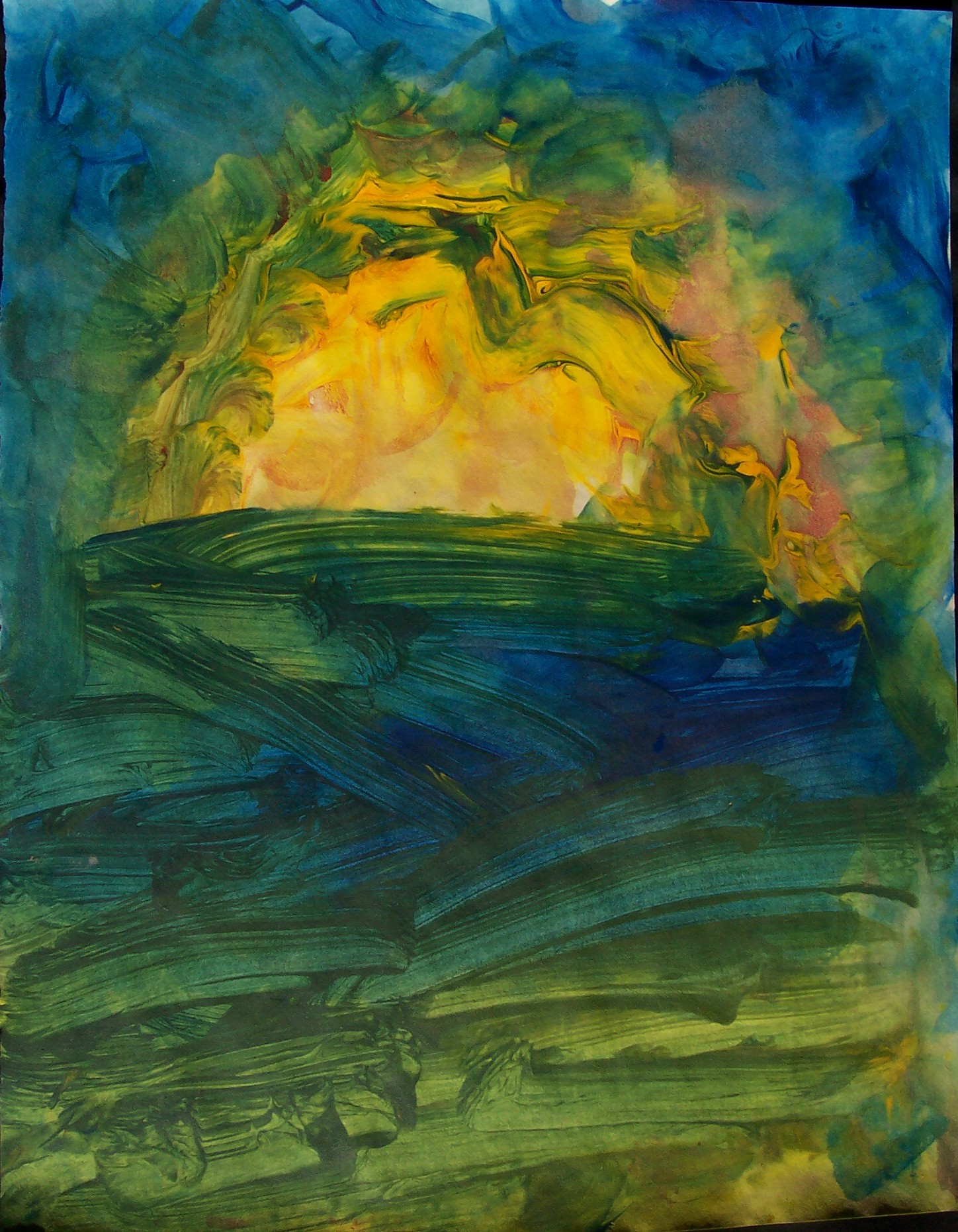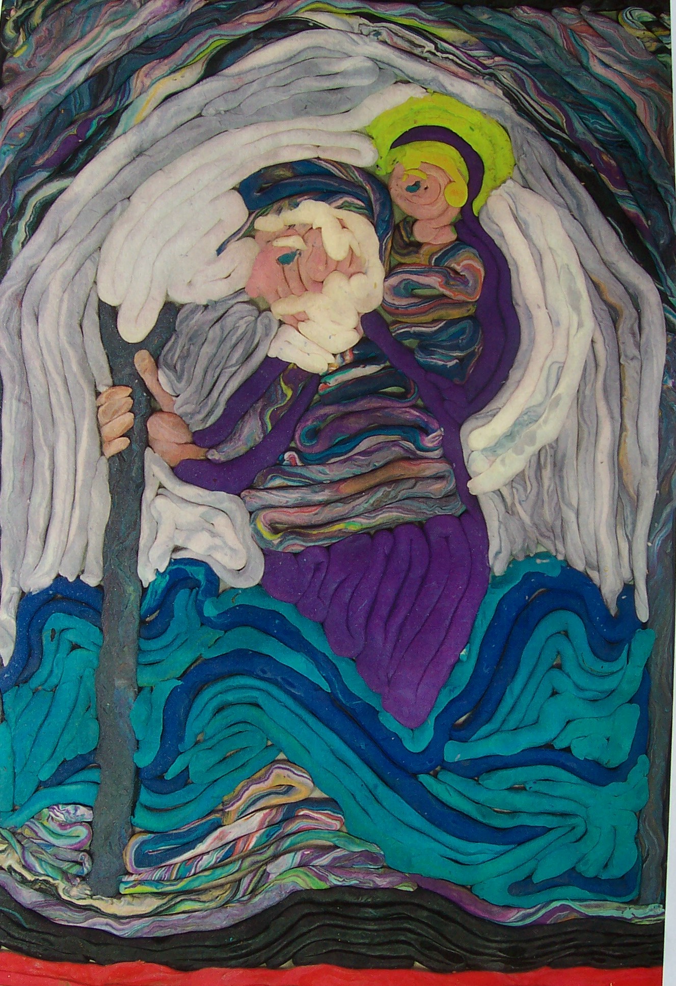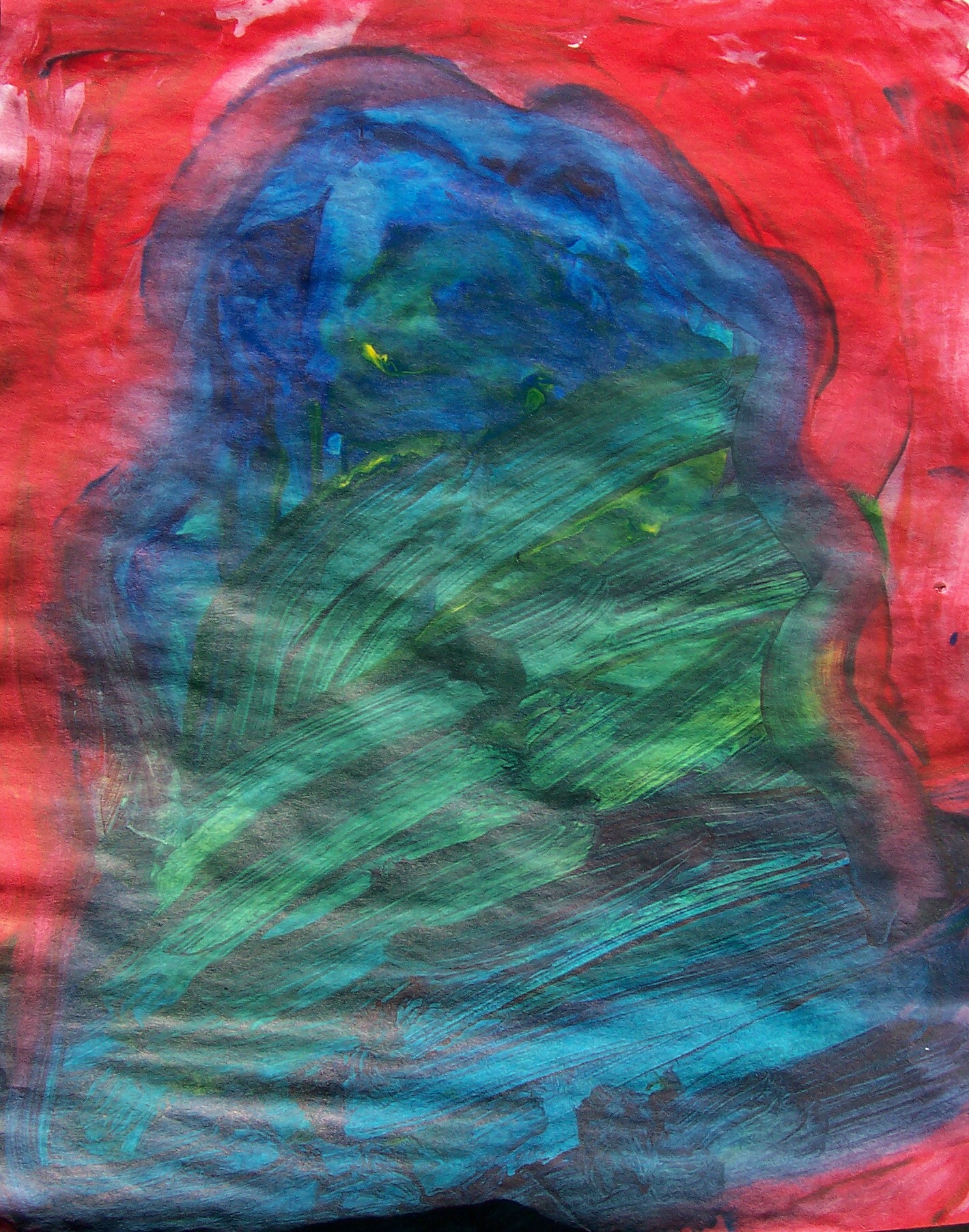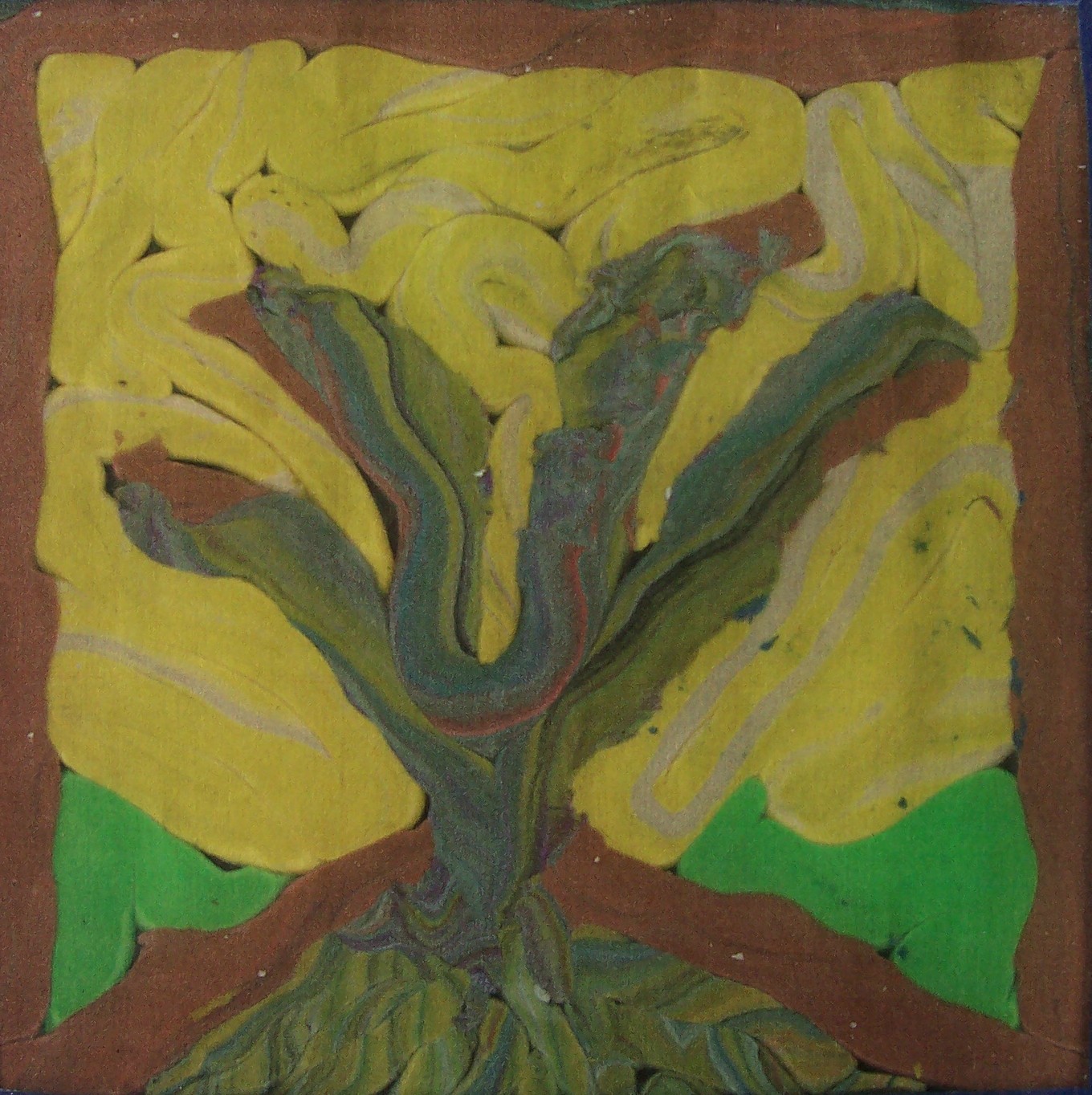 Sam paints two paintings in quick succession. He pays attention to the rhythm rather than the process itself. I help him by making strong light/dark contrasts which he sometimes sees. Sam’s seriously impaired vision seems to fluctuate. He can blow a cigarette ash into a small hole in a can, at times; yet, cannot distinguish the coloured clay on the table a short time later. I suspect that he has tunnel vision, which might also explain his accuracy at bowling. His two abilities with picture-forming are rolling the plasticine clay, and mixing the colours of clay to get a ‘marbled effect’. He is comfortable with this, and enjoys it.