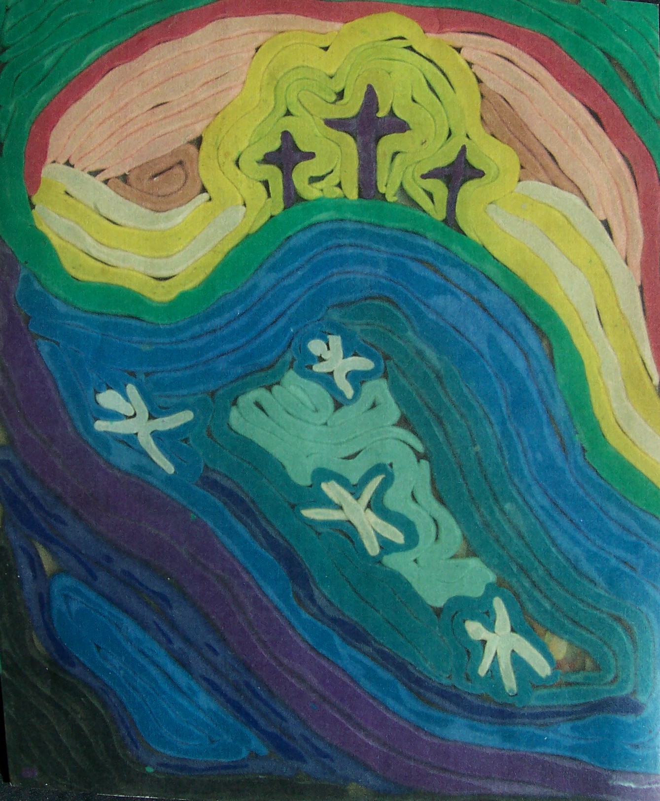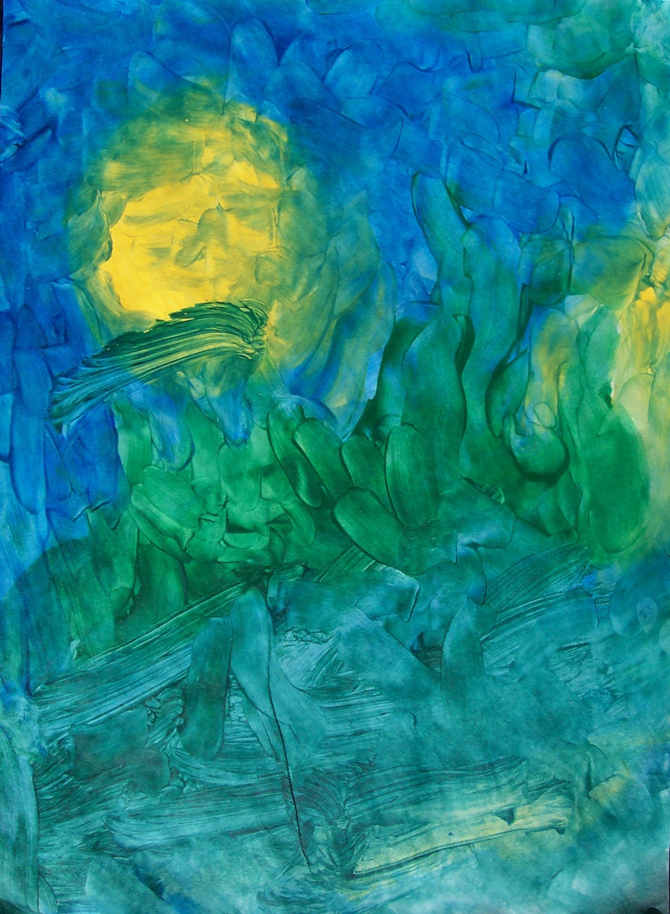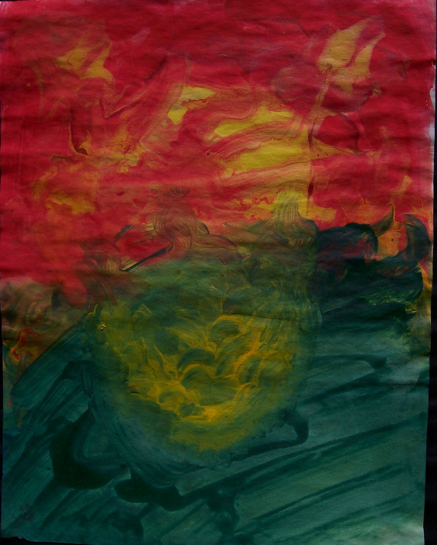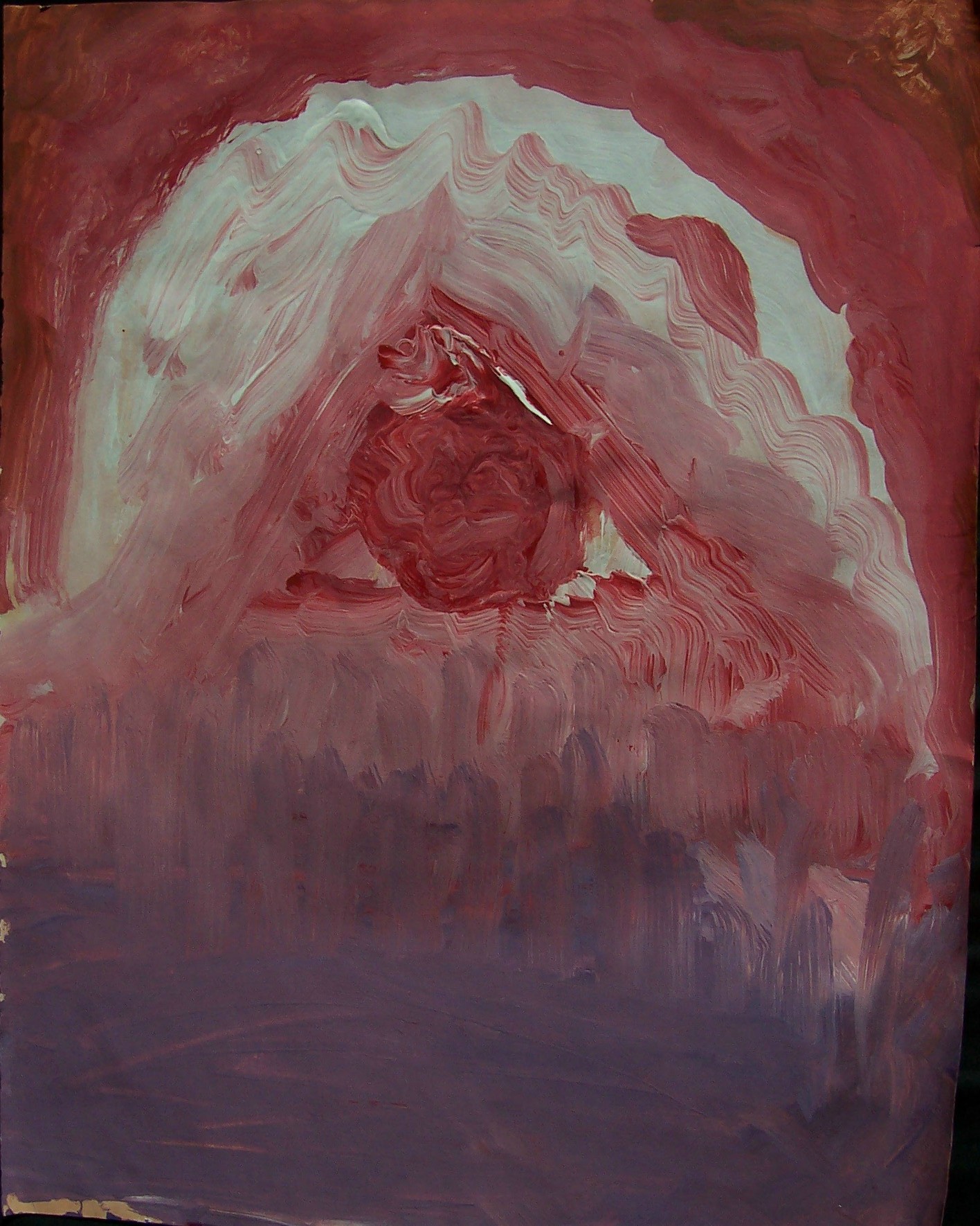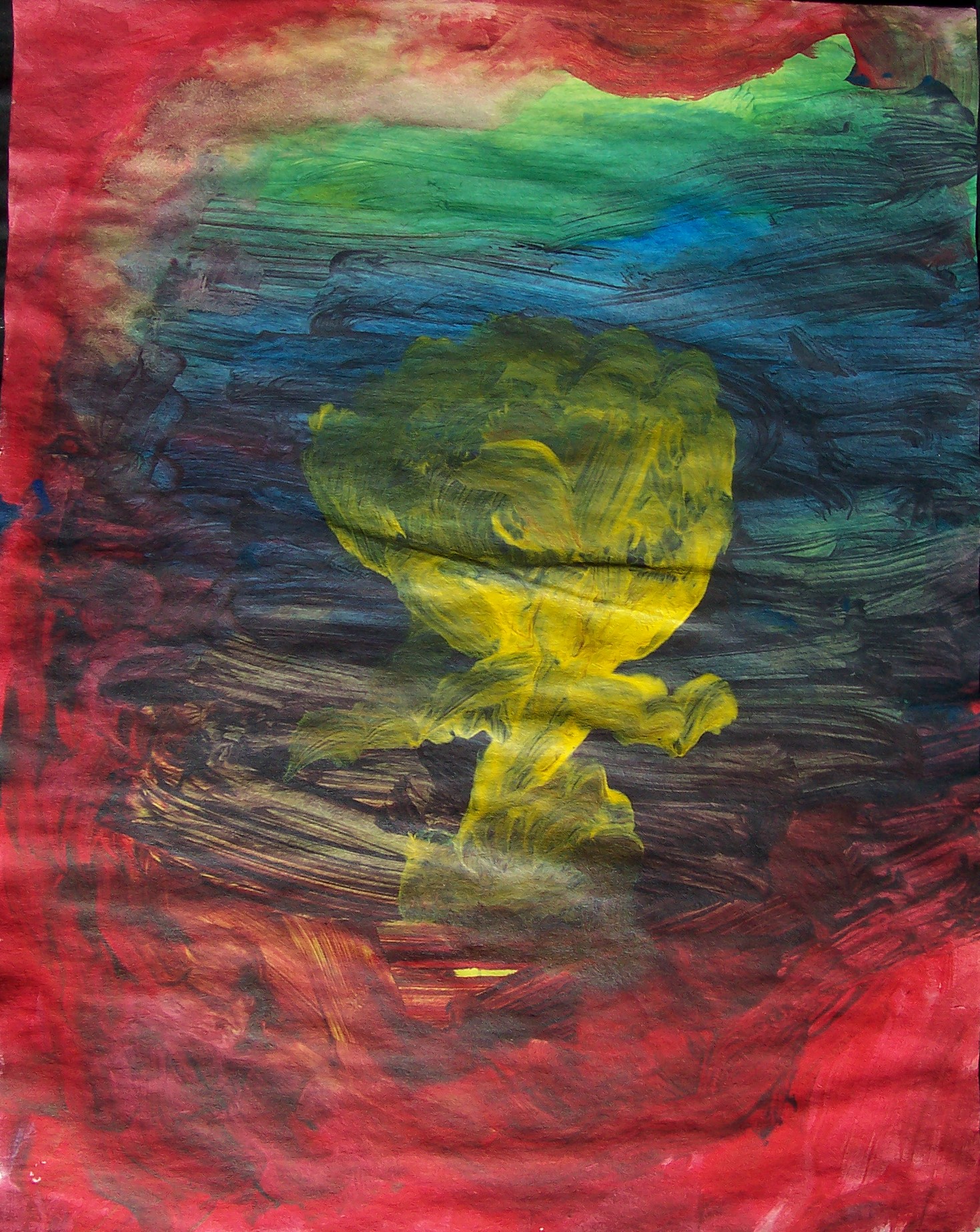 Sam paints two paintings in quick succession. He pays attention to the rhythm rather than the process itself. I help him by making strong light/dark contrasts which he sometimes sees. Sam’s seriously impaired vision seems to fluctuate. He can blow a cigarette ash into a small hole in a can, at times; yet, cannot distinguish the coloured clay on the table a short time later. I suspect that he has tunnel vision, which might also explain his accuracy at bowling. His two abilities with picture-forming are rolling the plasticine clay, and mixing the colours of clay to get a ‘marbled effect’. He is comfortable with this, and enjoys it.