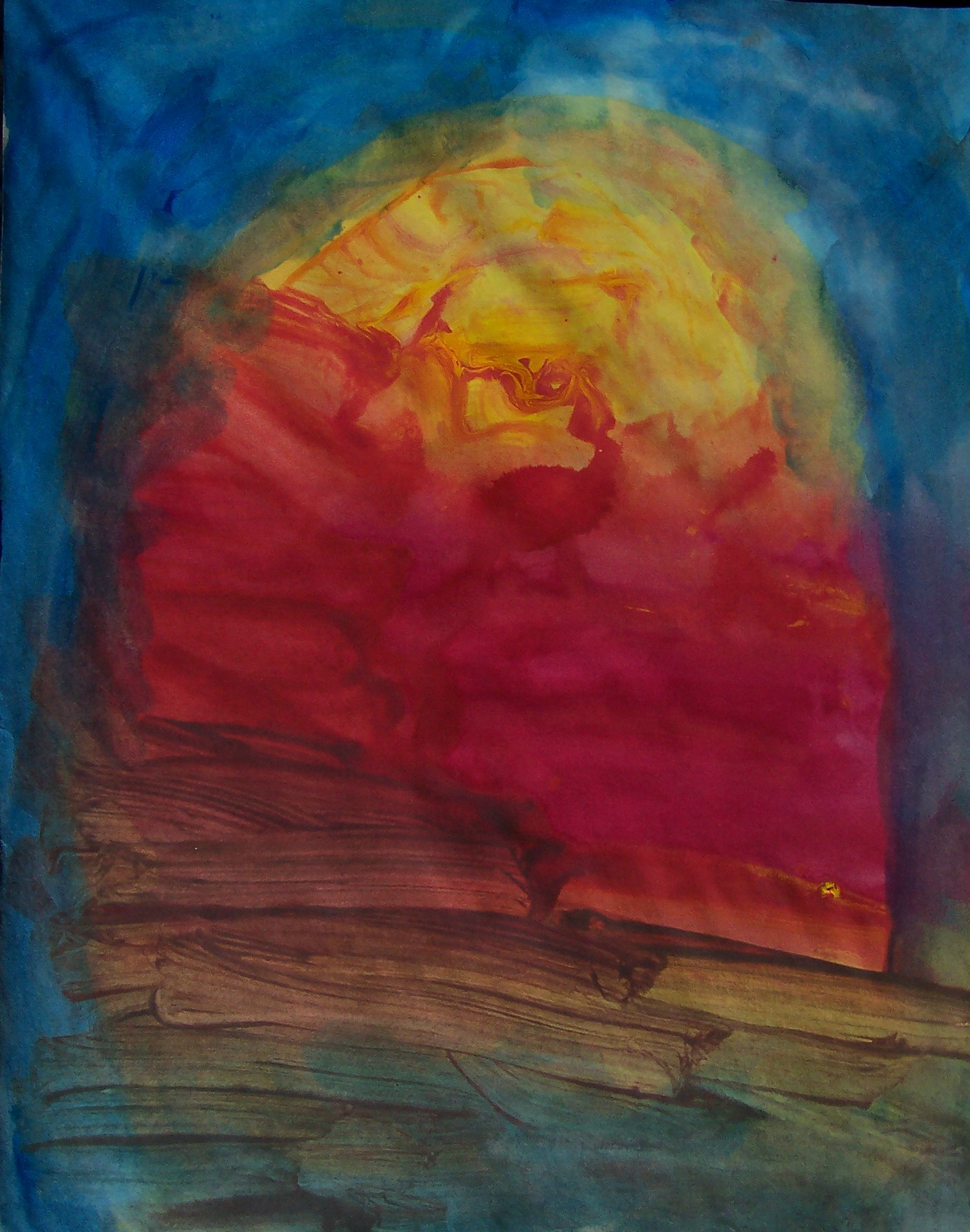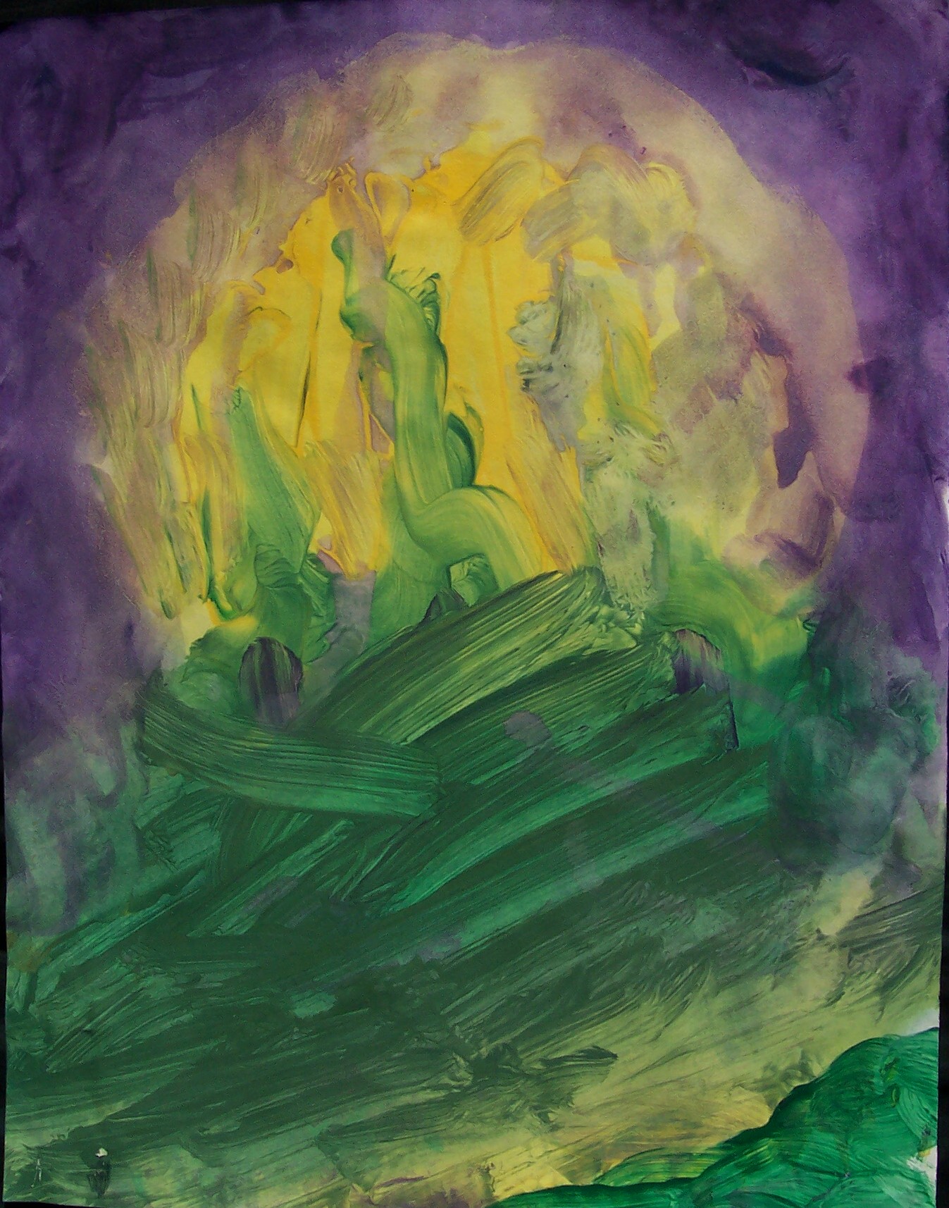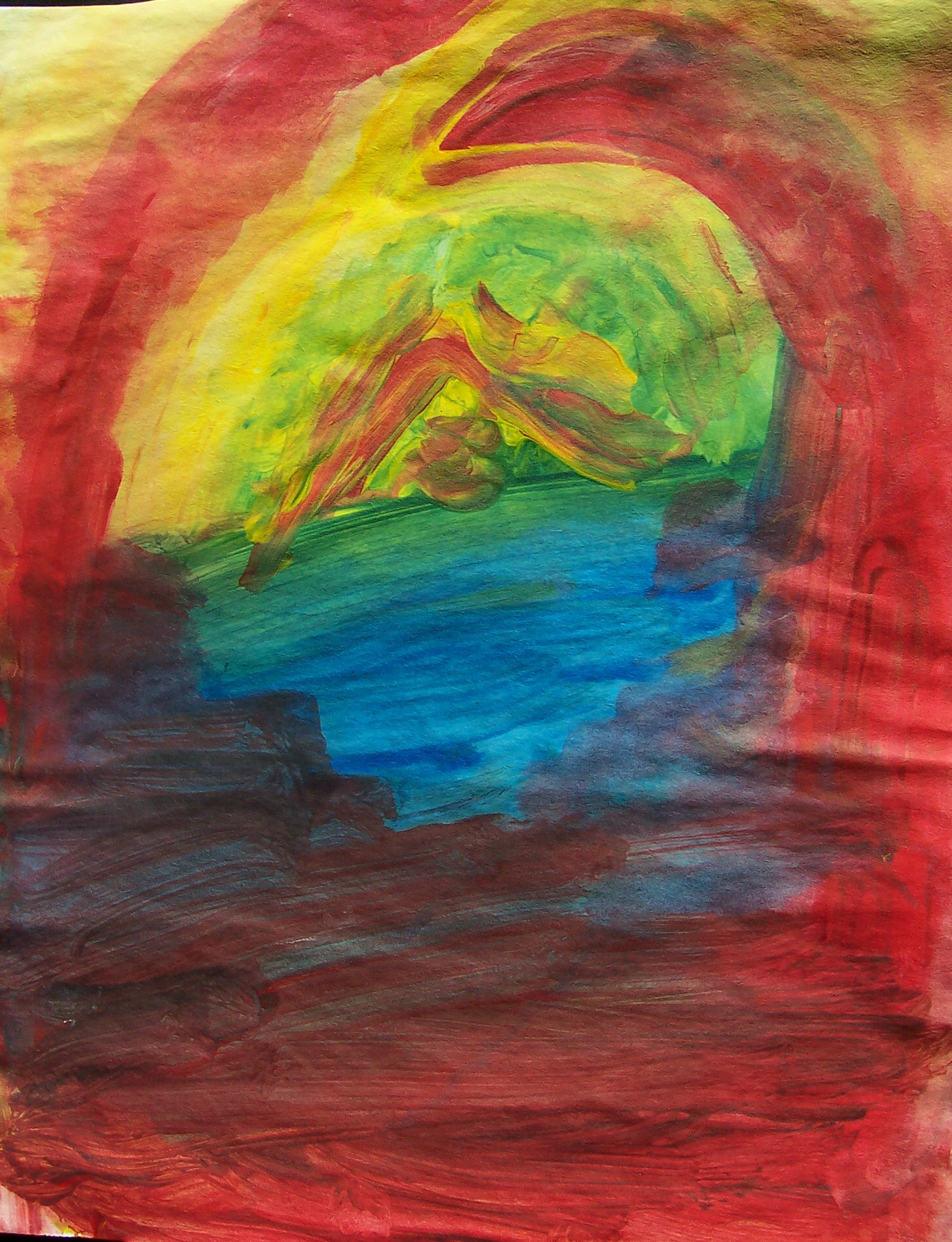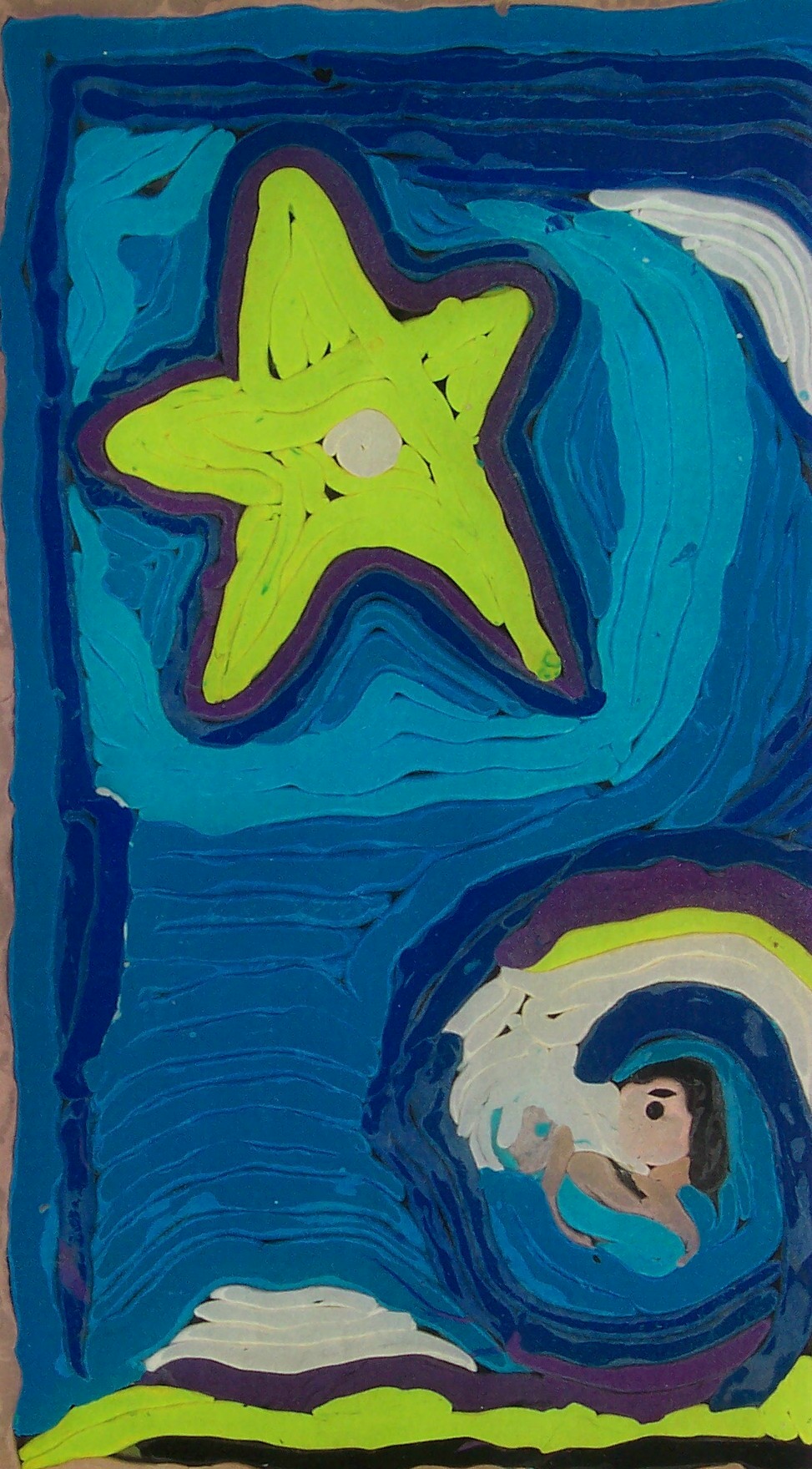 Sam paints two paintings in quick succession. He pays attention to the rhythm rather than the process itself. I help him by making strong light/dark contrasts which he sometimes sees. Sam’s seriously impaired vision seems to fluctuate. He can blow a cigarette ash into a small hole in a can, at times; yet, cannot distinguish the coloured clay on the table a short time later. I suspect that he has tunnel vision, which might also explain his accuracy at bowling. His two abilities with picture-forming are rolling the plasticine clay, and mixing the colours of clay to get a ‘marbled effect’. He is comfortable with this, and enjoys it.